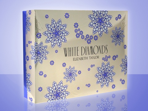 The QuikSet™ carton was converted utilizing metallized polyester board and offset printed with transparent gold, transparent purple, dense black, and opaque white inks, in-line with UV high gloss coating. Exquisite dome-embossed round and pear diamonds and blind-embossed flower petals add beauty and reinforce the White Diamonds brand.
