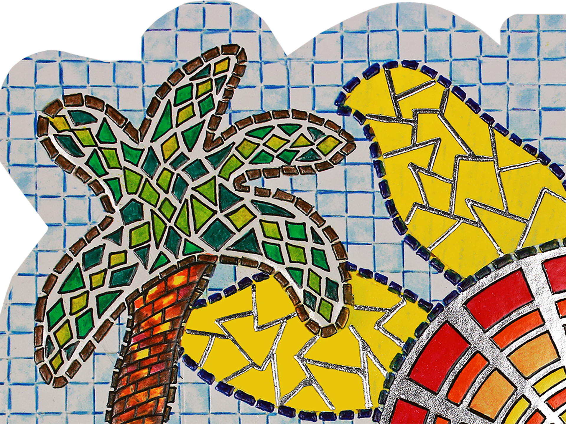 - Multi-level embossing was employed on the sun, palm trees, waves, fish, and seaweed.
